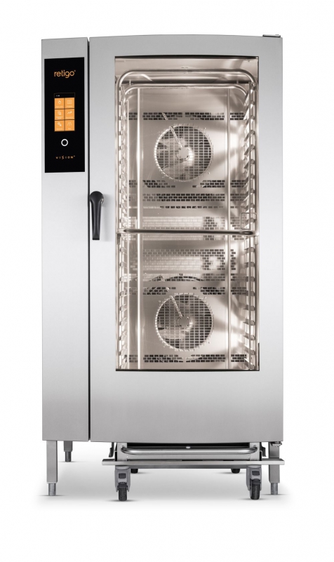 Retigo Vision 2011 combi ovens are best suited for 400–600 meal per day operations. The size of the gastronorm container is GN 1/1, or 530×325 mm. One of the fundamental accessories for this combi oven is a cart. Along with this size combi oven, customers can also purchase a variety of accessories, such as a spare trolley and equipment for serving food in a banquet style. A boiler or an injection steam generation system is available. Gas or electricity is the source of heat.